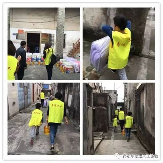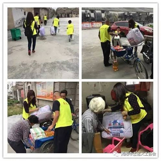 揭阳市志远义工协会1月7日到霖磐镇德北村为贫困家庭送去食用油、食用面、棉被、纸巾等爱心物资,并送上节日的问候,传达社会的关爱之情。