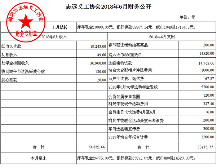 志远义工协会2018年6月收入支出明细